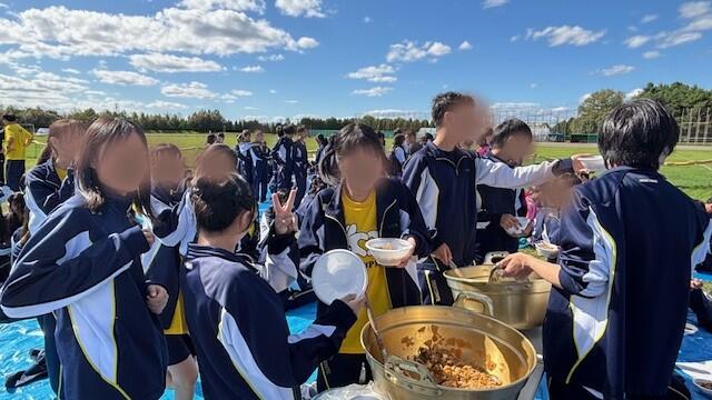 学校でとれたジャガイモ、タマネギ、ネギ、しいたけ、学校で育てた豚の肉、学校で作った味噌、こんにゃくいもから作ったこんにゃく…などを使った豚汁を青空の下でみんなで楽しく食べました